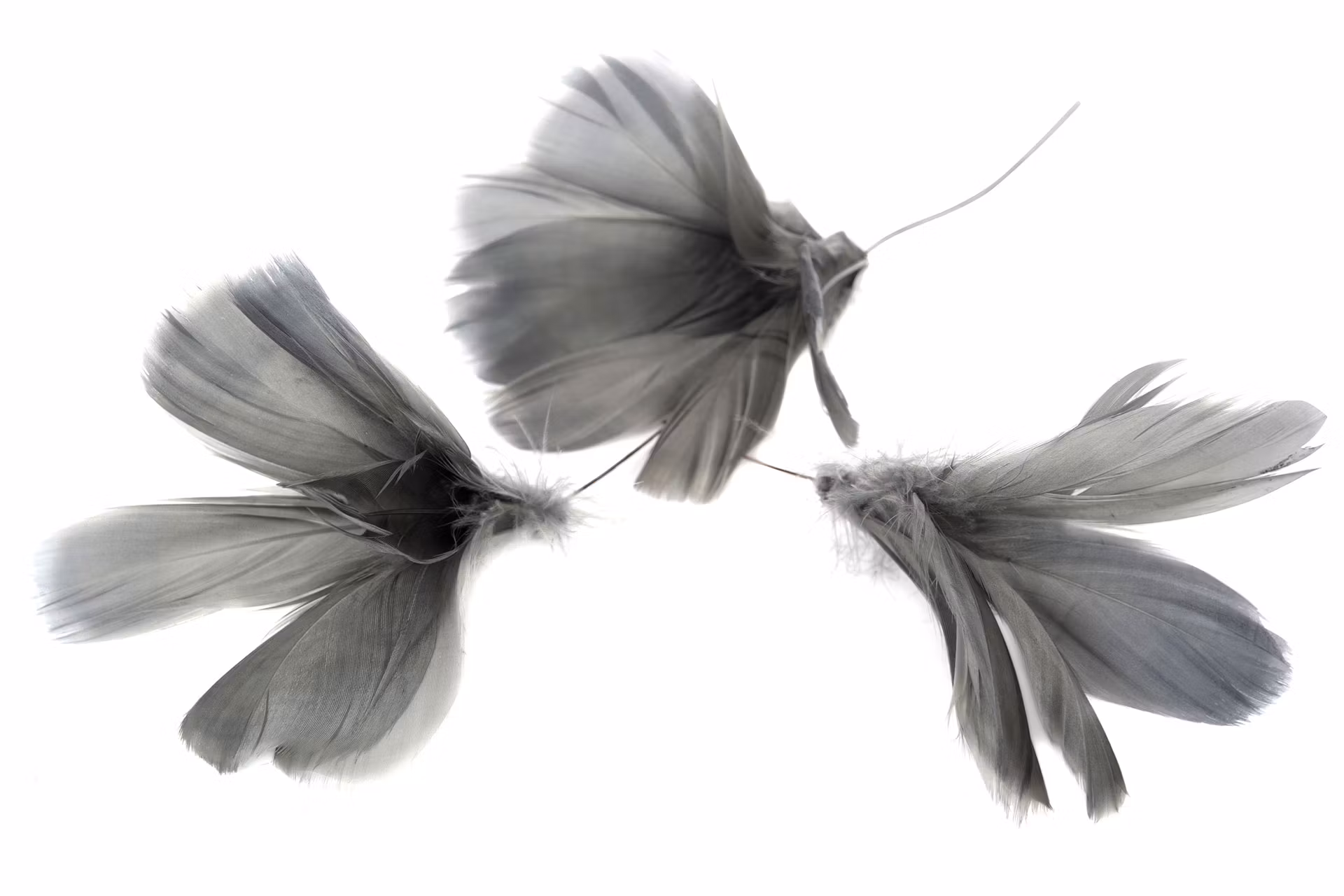 Fjäderblommor för dekoration, tre fjädrar som är formade till en blomma. Förpackningen innehåller 12 stycken fjäderblommor.