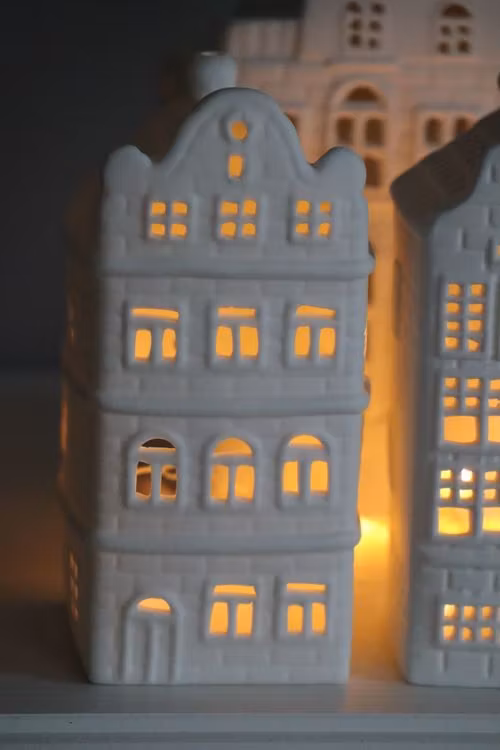 Ta med Amsterdam in i ditt vardagsrum med detta kanalhus i porslin. Väldigt dekorativa med välarbetade detaljer. Fina att ha flera stycken tillsammans som en liten stad. Avsedd för små värmeljus eller LED-värmeljus då lyktan kan bli väldigt varm. Går också lika bra att använda ljusslinga .
